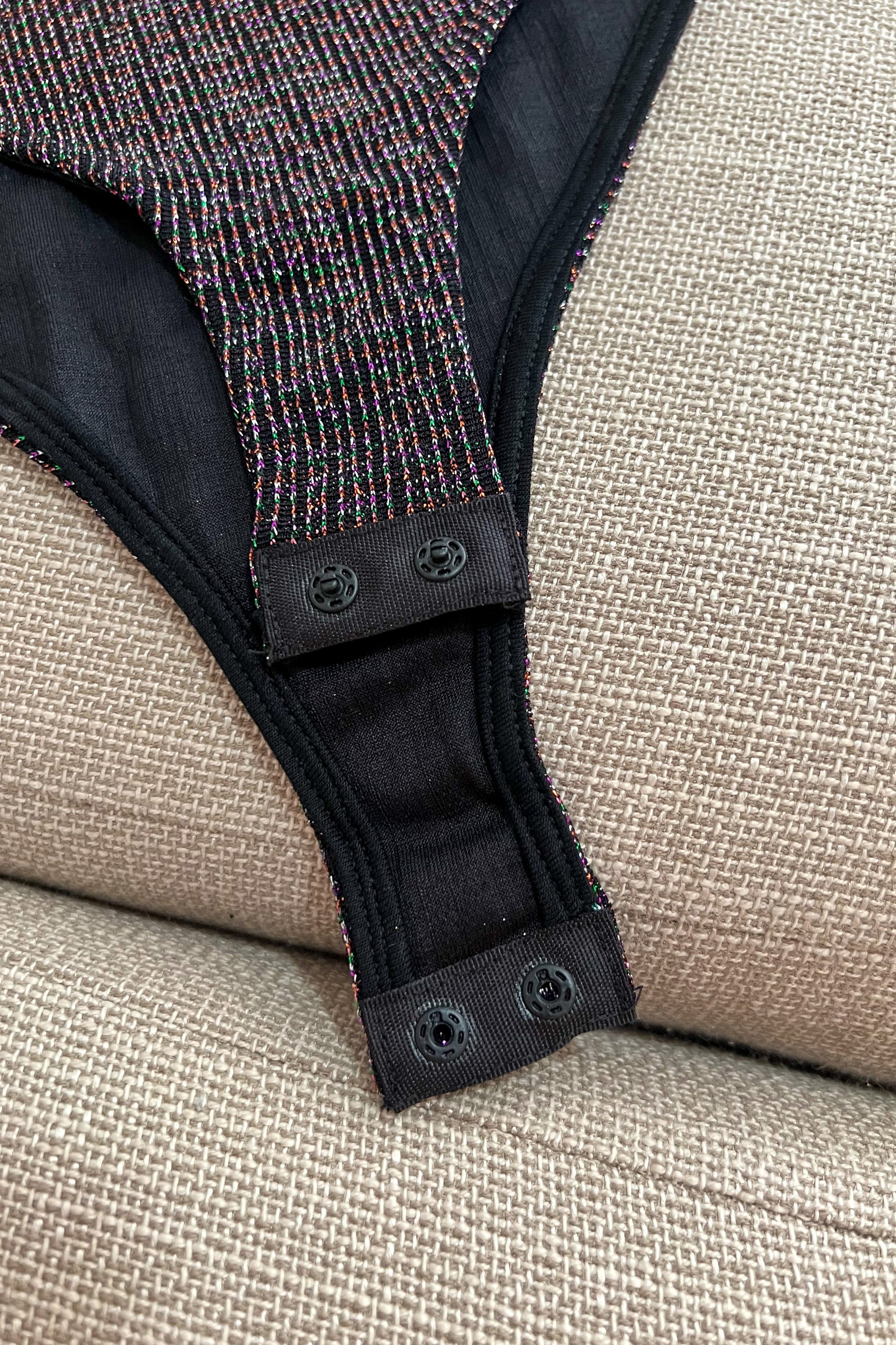 Sa légère ouverture en dessous de la poitrine et son tissu pailleté rendent ce body hors du commun. Idéal pour un outfit de jour (minimise vos traces de bronzage et confort+style) comme de soir ♡