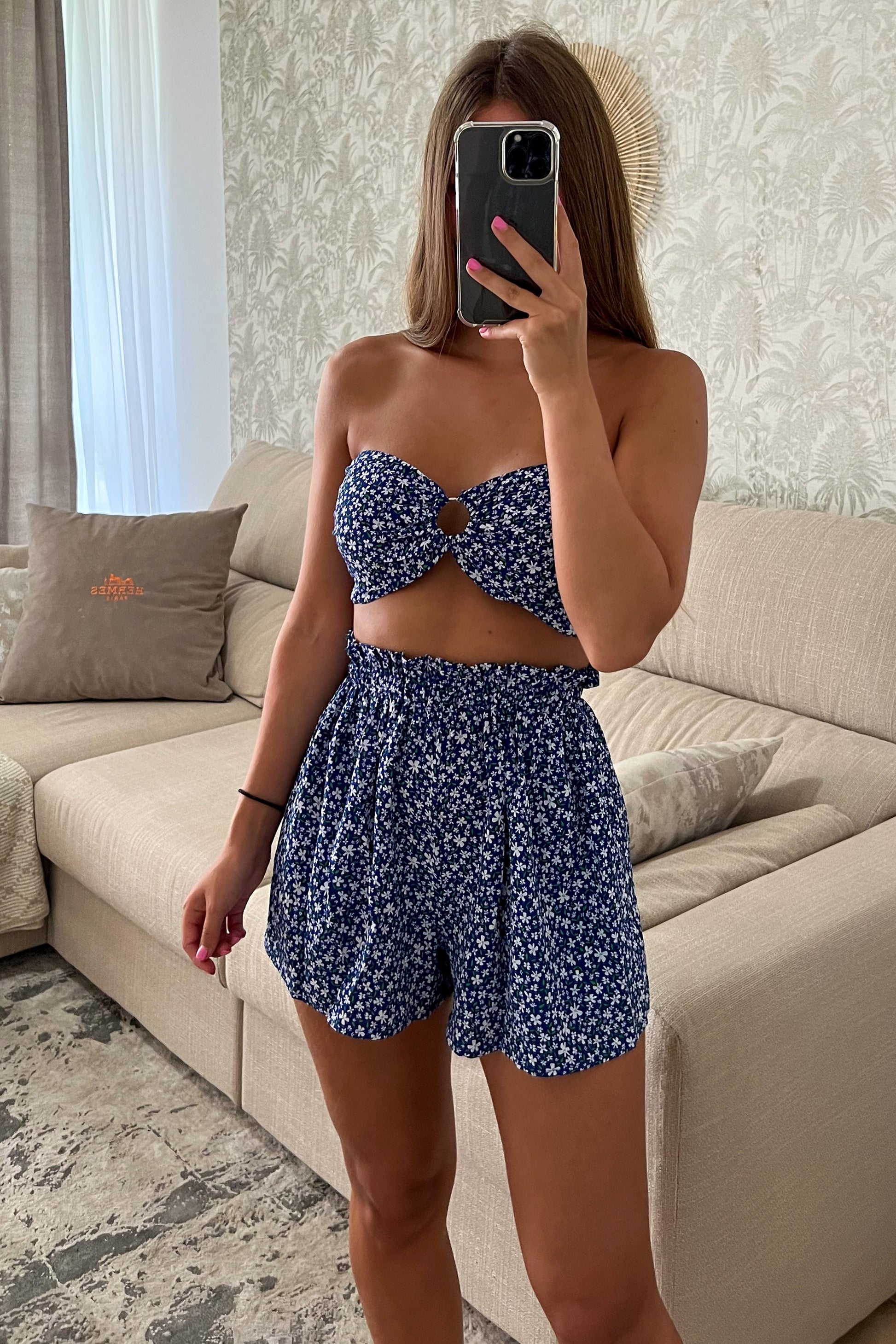 ❁ Ensemble top + short bleu (motif floral)