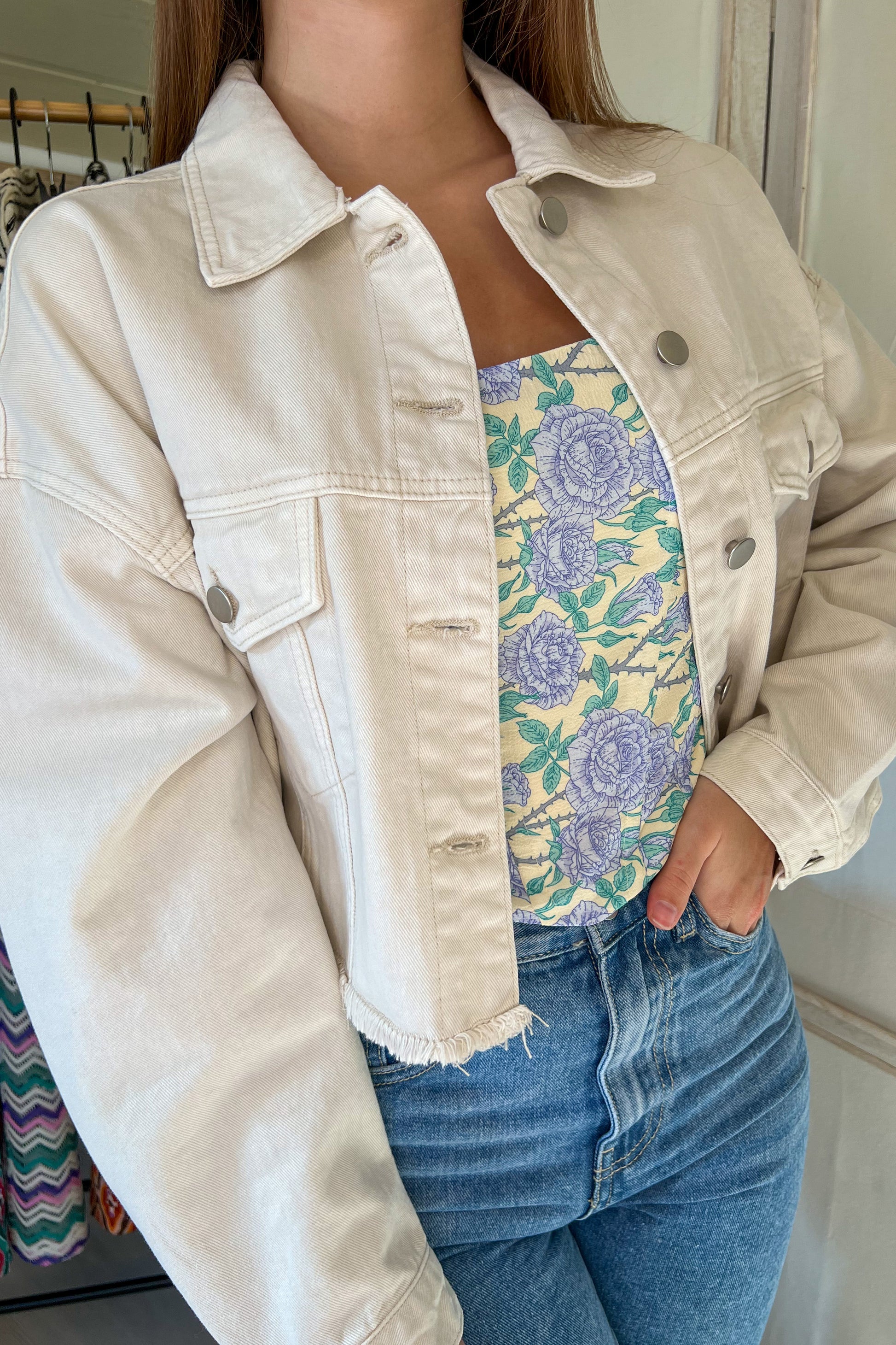 Cette veste est idéale pour terminer un look de printemps ou pour réchauffer une journée fraîche. Sa couleur beige classique s'associera parfaitement avec toutes les couleurs de votre garde-robe. Cette veste en jean beige est tellement facile à porter que vous ne pourrez plus vous en passer !