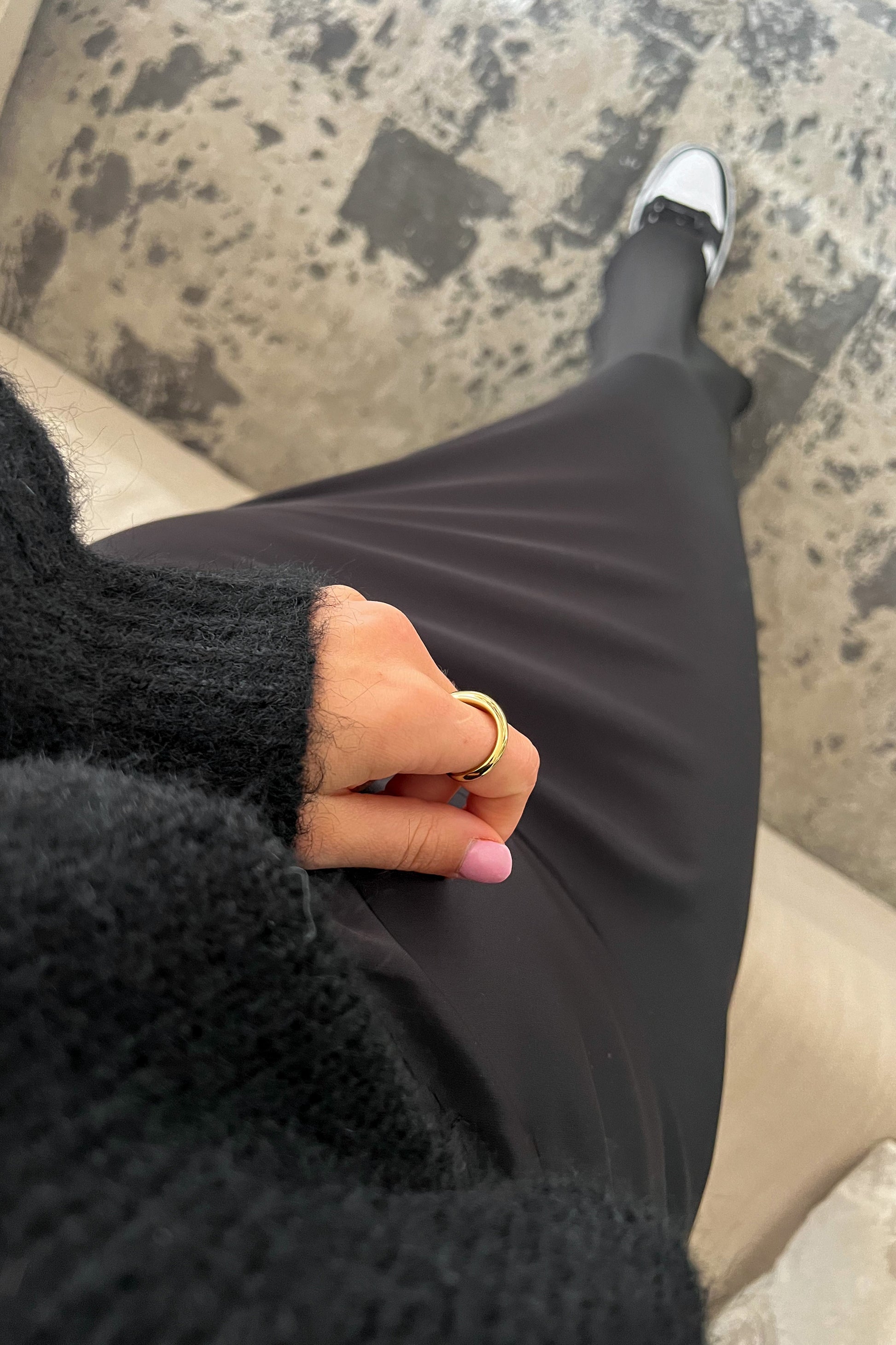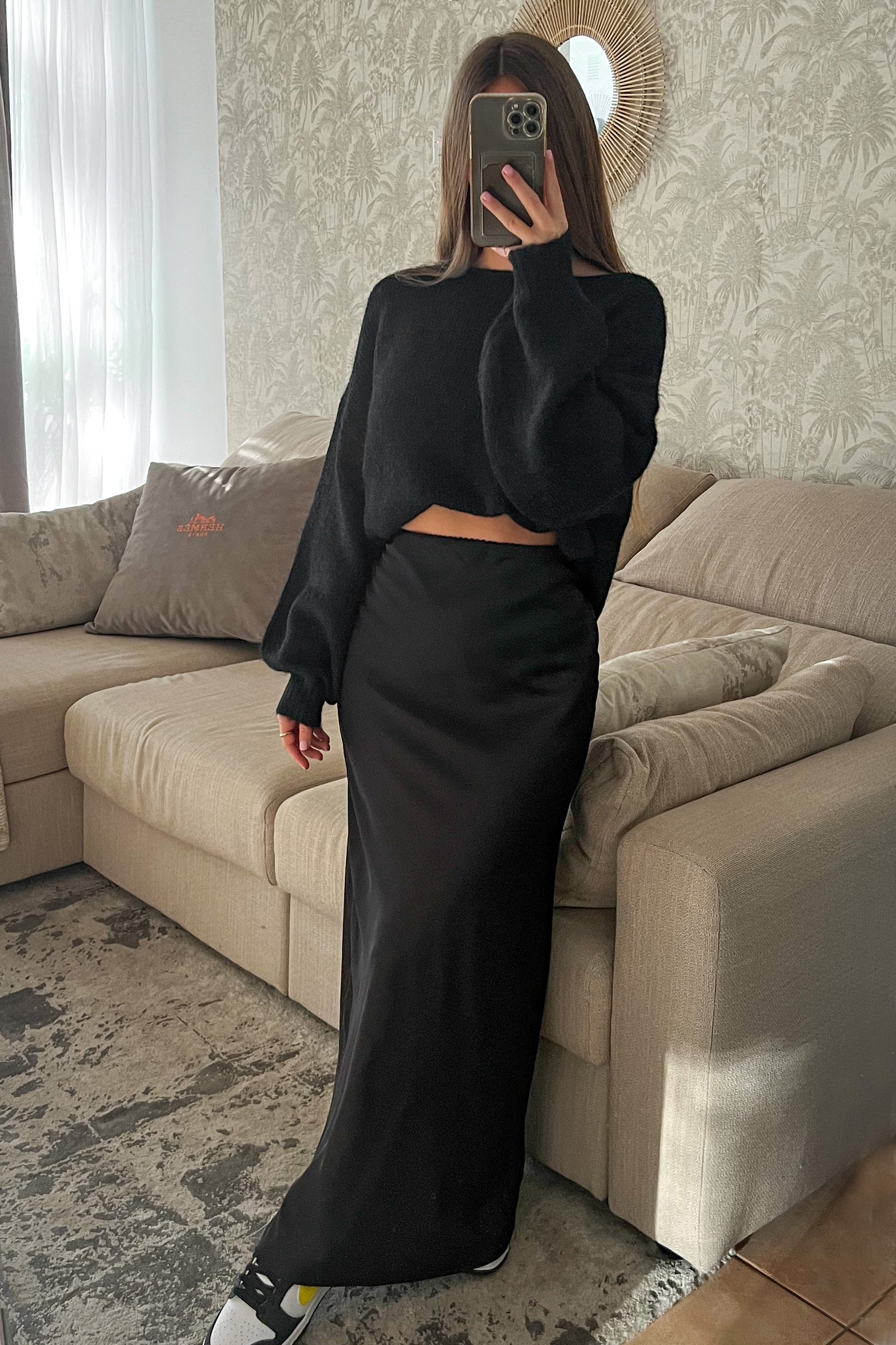 La jupe longue en satin noire, où l'article parfait : avec un gros pull pour les journées fraiches, avec un top pour les journées d'été ♡